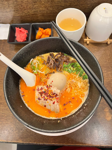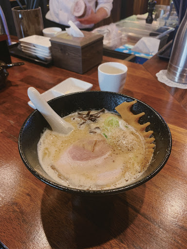 Ordered spicy ramen and tantan ramen. Tantan ramen has a thicker sauce with minced meat, very peanuty, and with some spices. It's served with some estras like crispy garlic. Spicy ramen was a normal ramen with thick broth and chicken breast. In this place, you can ask for extra soup, rice, or noodles serve for free. The rice for spicy ramen comes topped with 2 more slices of chicken breast, and the rice for tantan noodles came with extra crispy garlic. Also ordered their chicken breast dumplings, basically chicken breast wrapped in chicken skin, but the texture was not my favorite. The place is a little small, only 11 people fit inside. They will give hot pack for those...