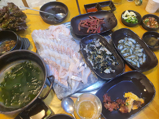 Read more성인 다섯명이 광어. 우럭 각각 1kg씩 2kg 먹었는데 맛있었고 양도 많아서 만족했어요. 또 기본으로 주시는 미역국과 번데기 맛있어서 추가로 먹었구요. 물회와 고갈비, 매운탕을 주문했는데 물회는 가격에 비해 맛있었는데, 탕이나 고갈비는 생각보다 맛있지는 않아서 좀 많이 남겼어요. 그리고 뻥 뚫려있다보니 너무 시끄러워서 대화가 힘든 점은 있었어요. 그래도 회가...