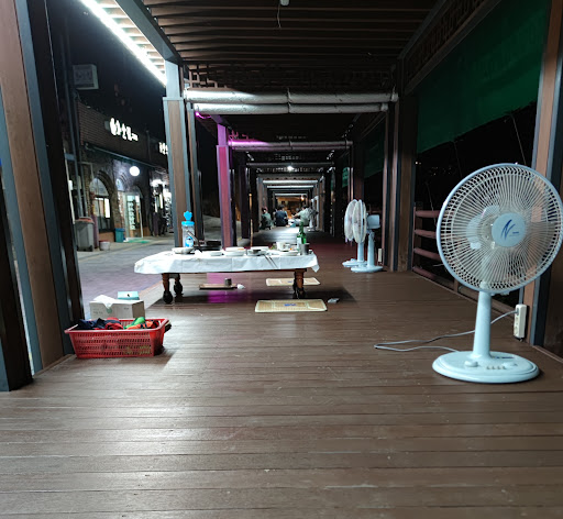 Restaurante situado en el centro histรณrico de Jeonju , al lado del rio , una zona con un templete en el que se sitรบan 3 restaurantes. La comida se sirve en ese templete.