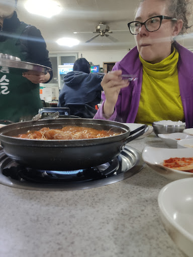 Read moreComimos una especie de guisado de carne de cerdo que viene con brotes de soja y esos fideos translúcidos. Viene con acompañamientos como ser un poco de kimchi, esos nabos encurtidos amarillos, chiles verdes, ajos y hojas de lechuga para que hagas una especie de "tacos" envolviendo la carne y demás del guisado. Por lo que vimos es un menú único, no sabemos si cambian cada día por uno diferente o es siempre el mismo. Es un poco picante, así que debes tenerlo en cuenta. La atención fue súper amable y al vernos extranjeros, nos explicaron de manera simpática cómo comerlo. Una experiencia muy coreana que valió la pena. El precio fue de 15.000 wones por persona más 1000 por cada porción de arroz. No es muy económico pero si quieres una experiencia culinaria locataria,...