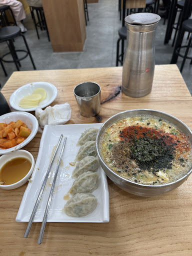 Read moreFood was super delicious. I got the main noodle soup (hot noodle I think) along with meat mandu. Staff speaks English. They have an English menu too. Price is insanely cheap for the value of the food. Come with an empty stomach though, it’s a lot of food. For foreigners that don’t eat at Korean restaurants often, look for a drawer on the side of your table which has napkins and silverware. It is a little loud in there so if you’re looking for a fun meal out, this is the place, but it’s not quiet or cozy by...