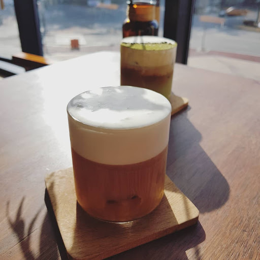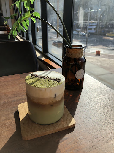 진주 도동 저 구석 신축 아파트 단지 입구의 건물 2층에 위치한 분위기 좋은 까페입니다. 넓도 천장이 높아서인지 사람들이 많아져도 크게 시끄럽지 않더라구요. 이름이 생각나지 않은데 말차크림라떼? 진짜 너무 맛있었어요. 이런 위치에 이런 수준급의 맛이! 랄까요 ㅎㅎ 베이커리가 조금...