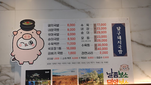 밀양의 돼지국밥전문집. 돼지국밥집으로 맛과 분위기등 모든것에 만족 앞쪽에 주차공간있고 가게 옆에도 주차가능함. 돼지국밥은 진한국물맛인데 특이하게 마늘을 다데기처럼 넣어 마늘맛이 나는데 이게 이집의 특징이며 진한국물과 함께 잘어울림 물론 마늘을 싫어 한다면 안되겠지만. 반찬으로 나오는 김치와 깍두기도 맛있고 직원들도 친절하며 응대 빠르고 가격은 국밥 8천원으로 평균적인 가격임. 단 국밥에 고기양은 조금 작다는 생각. 그리고 이집의 특이한 메뉴로 수육찜이 있는데 돼지고기수육과 콩나물찜의 조합으로 나온다는데 먹어 보지는 못함. 다들 최고라는데 다음 기회에 먹을 생각임. 같이 함께한 지인도 최근 돼지국밥중에 최고라함. 다음에 수육찜을 먹었는데 최고임. 수육도 좋고 콩나물과 새우가 들어간 찜은 밥과 함께해도...