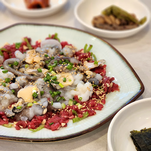 일단 낙지 탕탕이를 시켜서 먹었는데요 진짜 서울, 경기에서 먹는 맛이랑은 차원이 다릅니다. 낙지가 입안에 붙어서 번거로울 지경이에요. 육회도 진짜 신선하고 기름진 맛이 하나도 없게 느껴집니다. 전부 싱싱해요. 반찬들도 하나같이 맛있고 2인이상 시킬 수 있는 날치알 볶음밥이 있는데 완전 요물이에요. 낙지탕탕이를 조금 덜어가서 볶음밥을 만들어주시는데 고기향이랑 낙지가 같이 볶아지면서 불향도 입히셔가지고 한입먹으면 입이 행복해집니다.