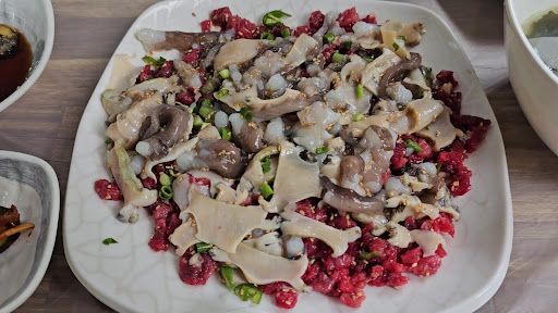 must dine here!! ordered the signature dish; raw abalone, squid and beef. also ordered the bimbimbap. 1. eat as it is. 2. eat wrapped with kimchi and seaweed. 3. eat wrapped with bimbimbap, kimchi...