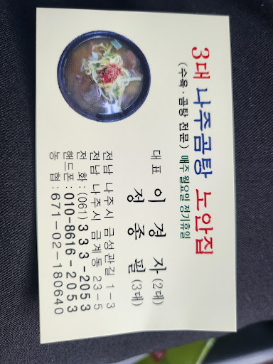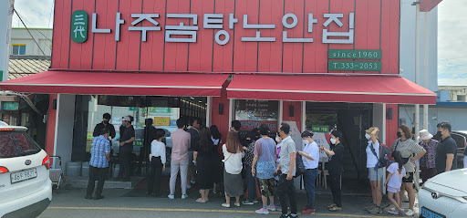 ๋์ฃผ์ ๋์ฃผ๊ณฐํ๊ฑฐ๋ฆฌ๊ฐ ์์ต๋๋ค. ๋์ฃผ๊ณฐํ์ ์์ ๋์ ๋์ฃผ์์ 100๋ ๋๊ฒ ์ด์ด์จ ๋ง์ ๊ณ ๊ธฐ ๊ตญ๋ฌผ์ ๊ตญ๋ฐฅ์ด์์. ์ฌ๋ฌ ์๋น์ด ๋ชฐ๋ ค์๋ ๊ณณ์ด๋ผ ์ด๋ ์ง์์ ์์ฌ๋ฅผ ํด์ผ ํ ์ง ๊ณ ๋ฅด๊ธฐ๊ฐ ์ด๋ ต์ต๋๋ค. ์ด๋ด ๋ ํ์ง์ธ์๊ฒ ๋ฌป๋ ๊ฒ ๋น ๋ฅด๊ฒ ์ฃ . ๊ฑด๋์ ์๋ ๋์ฃผ ๋ถ์๊ฒ ๋ฌผ์ผ๋ '๋ ธ์์ง'์ด ์ ์ผ ๋ง์๋ค๊ณ ํฉ๋๋ค. ๊ทธ๋์ ์ผ๋จ ๋ฏฟ๊ณ ๊ฐ๋ณด๊ธฐ๋ก ํ์ด์. โ ํ ์์ผ ์ค์ 11์ ๋ฐ์ ์๋น์ ๋์ฐฉํ์ต๋๋ค. ์ด๋ฏธ ๊ฑฐ์ ๋ง์์ด๊ณ ๋น ํ ์ด๋ธ์ด ๋ช ์์์ด์. ๊ฐํ์๋ Since 1960์ด๋ผ๊ณ ์ ํ ์์ต๋๋ค. 60๋ ์ด์ ์ด์ด์จ ๋์ฃผ๊ณฐํ ๋ ธํฌ์์. ์์์ ๋จ์ฒด์ฌํ์ ์ธ์ ์ค์ธ ๊ฐ์ด๋๊ฐ ์ด ์๋น์ ์ค๋ช ํด ์ฃผ๊ณ ์๋ค์. ์ด ์ง์ด ํ์ง์ธ๋ค์ด ๊ฐ์ฅ ๋ง์ด ์ค๋ ์๋น์ด๋ผ๊ณ ํฉ๋๋ค. ๋์ฃผ ๋ถ๋ค ์ ๋ง์๋ ์ด ๊ณฐํ์ด ์ ์ผ ์ ๋ง๋ ๊ฒ ๊ฐ์์. โ ๋ ธ์์ง์ด๋ผ๋ ์ด๋ฆ์ ๋์ฃผ '๋ ธ์๋ฉด' ์ง๋ช ์์ ์จ ๊ฒ ๊ฐ์์. ์ง๋ช ์ ์ด์์ ๋์ ๋ ธ(่)โ์ โํธ์ํ ์(ๅฎ)โ์ ์จ์, '๋์ด์ ํธ์ํจ์ ๋๋ฆฐ๋คโ๋ ๋ป์ด๋ผ๊ณ ํฉ๋๋ค. ์ด ๋ป์ ์๋น์ ํฌ์ํด์ '์ค๋๋๋ก ํธ์ํ ๋ง์ ์ง์ผ์จ ์ง'์ด๋ผ๊ณ ์๋ฏธ๋ฅผ ๋ถ์ฌํด๋ ๊ด์ฐฎ์ ๊ฒ ๊ฐ์์. โ ํ ๋ ด๋ ๋ฐฅ์ด ๋น์น๋ ๋ง์ ๊ณ ๊น๊ตญ๋ฌผ. ์ฝ๊ฐ ๊ฐ๋น์ด๊ณ ์์ ๊ธฐ๋ฆ๊ธฐ๊ฐ ์์ต๋๋ค. ๊ทธ๋ฆฌ๊ณ ์๊ฒ ์ฐ์ ์คํ์ ๊ณ ์ถง๊ฐ๋ฃจ๊ฐ ์ฌ๋ ค์ก์ด์. ํ ๋ ด๋ ๊ตญ๋ฐฅ์ด๋ผ ๋๋ฐฐ๊ธฐ๋ ๋จ๊ฒ์ง ์๊ณ ๋ฐ๋ก ํ๋ฃฉํ๋ฃฉ ๋จน์ ์ ์์ ์ ๋์ ๋ฐ๋ปํจ์ ๊ฐ์ก์ต๋๋ค. ๋ํฐํ๊ฒ ์ญ์ฑ์ญ๋ฉ ์ฐ์ด๋ฃ์ ๊ณ ๊ธฐ๋ ์ฌ๋ฌ ๋ถ์์ฌ์ ๋ง์บํ๊ฒ ์นํ๊ธฐ๋ ํ๊ณ ๋ป๋ปํ๊ฒ ์นํ๊ธฐ๋ ํฉ๋๋ค. ์ก์์ ๊ฐ์ด ์ด๋์ ๋ ๋์ด ์์ด์ ๋ง์๊ฒ ๋จน์์ด์.