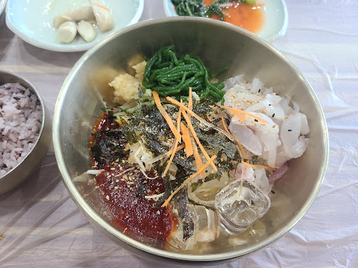도다리물회,명품횟밥시킴 밑반찬8가지가 다맛있었어요 깔끔하고 물회나오기전에 밥반그릇을 뚝딱! 물회는 초장과 고추장을 같이사용하여 맛이 진하였으나 초가약해서 전식초 더넣어 상큼하게 먹었어요 횟밥은 조금단맛이 강하였으나 제개인적으로 단맛을 즐기지 않았으니 ㅠㅠ 따라나온...
