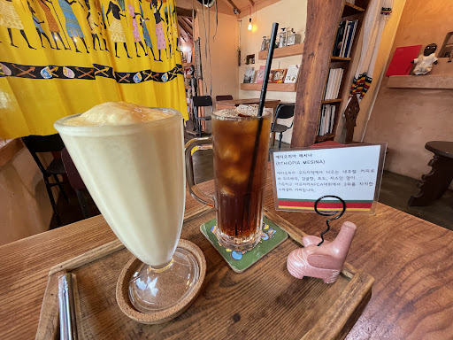 정기적으로 현지에 방문하고 소소한 교육지원 활동도 병행하고 계신다 한다. 그래서인지 카페 내부에는 현지에서 조달된 다양한 소품들이 적절한 곳에 비치되어 나름의 특색을 갖도록 해주어 작지만 알찬 아프리카 박물관을 둘러보는 듯한 느낌을 받을 수 있다.