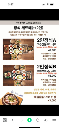Read more간단하게 먹기에는 금액 부담이 큽니다. 큰 행사, 모임 있을 때만 가기에 괜찮을듯합니다 불고기는 조금 달아서 애들이 잘 먹을 것 같아요 솥밥 안 먹는 어린이는 공깃밥 시킬 수 있다고 해요. 고등어는 간이 적절해서 같이 나온 간장에 찍어 먹기에 딱 좋아요😄 솥밥 밥 퍼먹고 솥에 물 부어서 누룽지 해서 먹으면 진짜 맛있어요~ 다 법고 누룽지까지 다 먹으면 배부르지만... 어르신, 부모님이 좋아하세요❤ 생일잔치, 부모님과 같이 모이는 모임에 가기에...