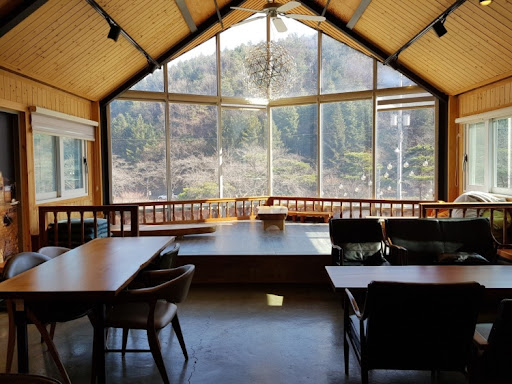 직지사공원 인근에 자리잡은 참 예쁜 카페다. 실내는 시원하고 탁 트인 공간으로 연출했다. 높은 층고로 인해 고급스러운 이미지를 연출한다. 다만 의자가 분위기와는 동떨어진 느낌이고 불편하다.