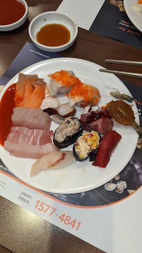 This Qoo Qoo in Gimcheon is way better than other Qoo Qoos in other areas. Hundreds of dishes like sushi, some pizza, fruits, salads, desserts and drinks are welcoming you in there. The price and dishes are quite different in lunch time and dinner time. I prefer dinner time. I am sure it is better in dinner cuz it is more expensive and provides more variety in foods. There is two-hour limit but I think staff doesnโt care that much if...