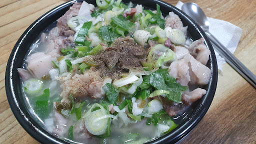 이어서 나온 국밥은 넘치려 하는 국물에 파가 듬뿍 얹힌 채 후추가 아낌없이 뿌려져 있었다. 살코기보단 비계 위주의 머릿고기가 들어있어 잡내를 잡으련 게 보였다.