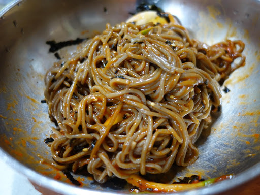 비빔메밀국수를 주문하면 나오는 육수를 부어 잘 비빔비빔하고 후루룩후루룩 쳐묵쳐묵하면 ....