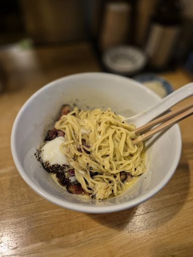 기본 메뉴도 있지만, 이 곳의 백미는 매주 바뀌는 특선 메뉴. 마침 내가 갔을 때는 수제 베이컨을 쓴 카르보나라 스타일 라멘을 선보이고 있어 이걸로 주문했다.
