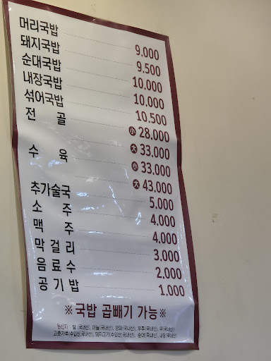 Read more위치가 다소 외곽지이고 주차장이 따로없어서 옆 골목에 자리남는곳 주차후 걸어가셔야 합니다. 맘카페보고갔는데 솔직히 제 입맛에는 엄청 맛있다 까진 아니었고 다른 흔한 국밥집보단 "조금더 괜찮다?" 정도 였는것 같고 국물은 아주 뽀얀국물인데 뽀약국물내기위해 가루를 좀 섞은거 같아 아쉽습니다. 차라리 안섞었으면 끝맛까지 깔끔했을텐데 끝맛에 뭔가 가루섞은특유의 맛이 입안에 남아서 아쉬웠네요. 저는 섞어국밥 (10,000)먹었는데 순대 2개+고기 내장 섞여있었는데 고기양이 엄청많아서 좋았던거 같네요 자리 않으실땐 에어컨 직으로 쏘는 밑에는 앉지마셔요~너무 빨리식어 버려서 금방 국물이 미지근밍밍해짐..ㅎㅎ참고!! 아침에 배가고파...