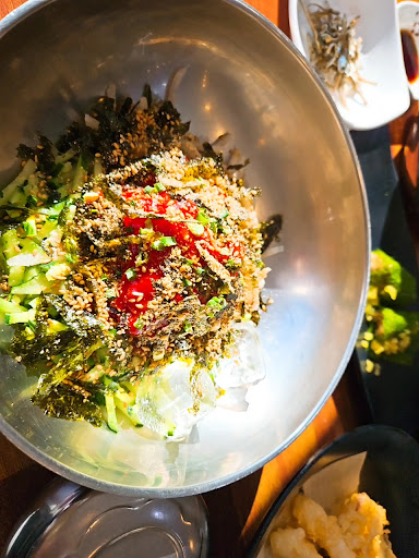 메인 메뉴인 포항물회는 부산이랑은 조금 다른 스타일입니다. 부산은 그냥 처음부터 물회 육수를 부어서 나오는 경우가 많은데, 이곳은 육수가 따로 제공됩니다. 본인이 원하는 만큼 넣어서 먹을 수 있고, 또 이렇게 따로 주니 밥알이 불지 않아서 더 좋은것 같습니다.