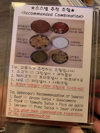 Read moreThe most attractive thing of this place was the closing time. They close at 2am. It was tasty for me. I had the signature manu, Go Boogie fajita. With the menu, I could enjoy pork, beef, shrimp. It came with 6 different sauces and wraps. On the side, French fries. Threes was a recommendation when I made a wrap. They recommended what kinds of sauces would be match better with a...