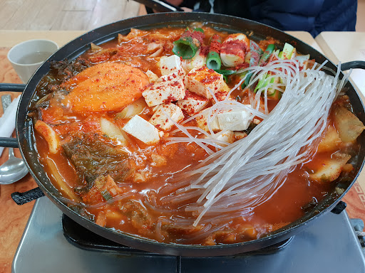 You can try a traditional Korean food, Kimchijjigae with a reasonable price(7,000won). It is served with some side dishes and a rice bowl. The taste is quite good but...