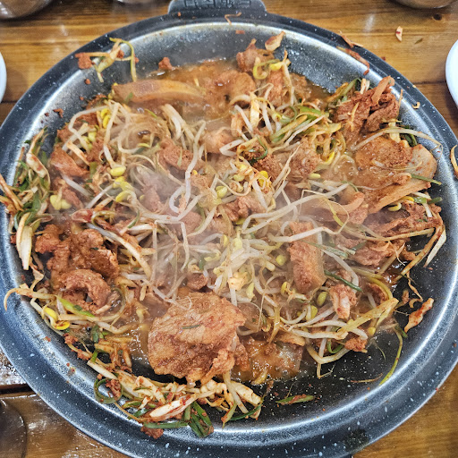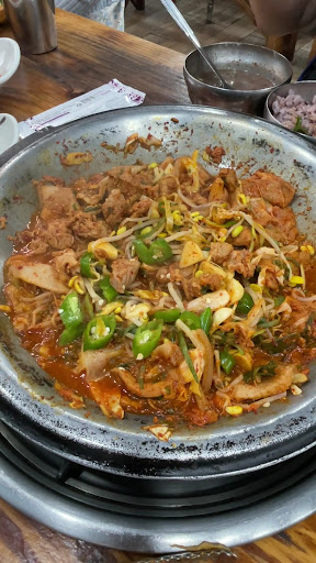 Read more음식 물가 비싼 제주도에서 가성비 최상위급 식당. 기본적으로 예전에 유행하던 콩불과 비슷한 맛이다. 함께 나오는 순대국이 특이한데 구수하니 맛이 좋다. 걸쭉한 피순대 국물에 해조류가 들어간 것 같다. 순대국 메뉴가 따로 있는데, 순대국을 시켰어도 만족했을 것 같다. 기본 찬들도 허툰 메뉴가 없다. 찬중에 마늘과 고추는 향이 굉장히 강하지만 그 자극적인 맛이 좋다. 고기는 흑돼지인데 음식가격이 있다보니 익숙한 부위는 아니다. 근고기 쪽으로 추측 된다. 부위는 전혀 상관 없다. 식사를 마치니 달콤한 디저트가 생각난다. 바로 옆 슈퍼에서 메로나 하나 사서 조용한 동네를 한바퀴 걸어보자. 고요한 숲속 마을에 울려퍼지는 새소리가 비현실적이다. 온 나라가 부동산 광풍인 이 시점에 무리해서 제주도에 집한채 사고...