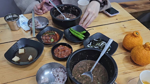 Read more아주 정겨운 식당 주변 마을 현지인들이 자주 찾는 단골식당 느낌이다. 우리가 갔을때는 문닫기 직전이었는데 두테이블이 있었고 모두들 주변 마을주민같았고 두루치기를 드시고 계셨다. 아무래도 두루치기 맛집인것같았다. 우린 몸국을 먹으러 갔기에 몸국을 시켜 먹었다. 몸국은 아주 맛있었다. 그냥 몸국과 순대정식이 있었는데 순대정식은 몸국에 순대가 들어가 있는것외에는 큰 차이는 없었지만 맛은 약간 달랐다. 몸국은 순전히 해초류와 고기의 맛으로만 이루어져있는데 순대정식은 순대맛이 추가되어서 약간 순개국밥느낌이 난다. 난 개인적으로 순대정식이 더 맛있었다. 그리고 이식당의 가장 큰 장점은 사장님이신것같다. 사장님이 진짜 너므너무 친절하시다. 손님들을 다 동네이웃사촌 대하듯이 해주셔서 너무 정겹게 느껴진다. 식사가 끝난후에는 식당 중앙에 있는 석유난로 위에 계속 끓여지고 있는 유자차를 주신다. 근데 유자차가 우리가 먹던 그런 유자차가 아니라 맑고 깔끔한 느낌의 유자차였다. 사장님 말로는 제주도 토종 유자청을 24시간 계속 끓여서 만든 차라고 하셨는데 아주 깔끔하고 좋았다. 그리고 마지막으로는 가자고 계셨던...