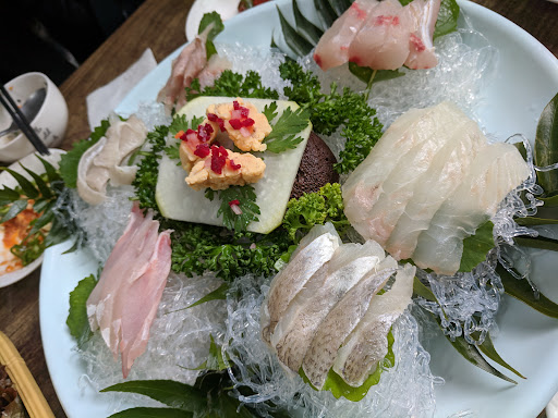 only thing is Korean sashimi just different from Japanese sashimi..the cut, selection, texture, sweetness not jap sashimi standard..this a expensive fish I think whole fish..sashimi texture is tough and sinewy and lots of residue..we think need to eat with the leave and chilli dip like bbq pork rather than the usual wasabi & soyu