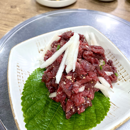 Read more제주도에 왔으니 말고기한번 먹어야겠지 싶어서 왔습니다. 고수목마 코스 1인 2만원이었구요 육회는 소고기 만큼 탱탱하진 않았지만 담백했고 간도 적당히 돼있어서 좋았어요 육사시미도 몇점 주셨는데 말고기의 장점이 더 느껴졌어요 찜은 뻑뻑했지만 그렇다고 못먹을 정돈 아녔구 서비스로 주신 안심구이는 살살 녹더라구요 글구 양념구이도 한번 굽는거 보여주시고 구워 먹었는데 살살 녹더라구요 특히 비계가 같이 붙어있는 부분은 엄지척!ㅋㅋ 마지막에 곰탕은 찐득하니 뭔가 말고기 특유의 비린내가 이런건가 싶은 냄새로 생소함에 아쉽게도 막 맛있게 먹진 못했어요 그 전까지 코스랑 서비스로 배가 너무 부르기도 했고...ㅋㅋ 하지만 떠나기전에 더우니까 드시라며 챙겨주신 얼음물 2병에 배보다 마음이 더...
