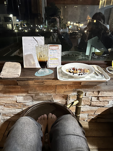 I stumbled upon a foot bath café purely by chance! The reviews were so good that I didn’t worry at all and just showed up the night before my trip without even calling ahead. The weather wasn’t great, and the sea was cloudy, but I didn’t mind. It was kind of perfect—the night sea with a soft glow from the lights, the scent of Nina’s herb blend and the foot soak mix, plus Earl Grey yuzu tea and a complimentary croffle. Those 30 minutes felt luxuriously long and relaxing.