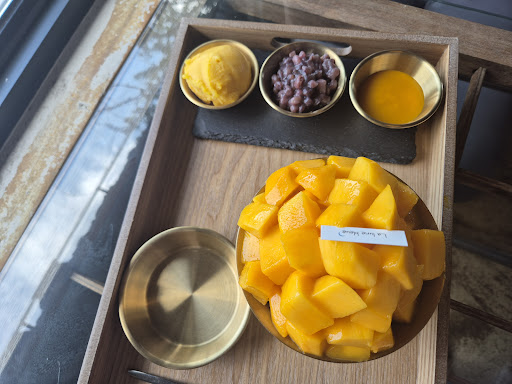 이곳의 대표 메뉴는 제주 특산 과일을 활용한 디저트로, 특히 제주 애플망고 빙수가 유명합니다. 탐스럽게 잘 익은 망고 과육이 듬뿍 올려져 있고, 함께 곁들여 나오는 망고 셔벗, 팥 앙금, 망고 소스를 더해 먹으면 상큼함과 달콤함이 절묘하게 어우러집니다. 신선한 망고 특유의 향긋함과 시원한 얼음의 조화는 제주에서만 맛볼 수 있는 특별한 여름의 별미라 할 수 있어요. 이 외에도 딸기 쇼트케이크, 애플망고 쇼트케이크, 소금빵, 다쿠아즈 세트 등 다양한 베이커리 메뉴가 준비되어 있어 선택의 폭이 넓습니다.