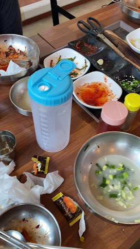 여름이라 에어컨 틀어서그런지 고기연기가 자욱함 (아마도 비빔에올라가는 고기굽는듯)