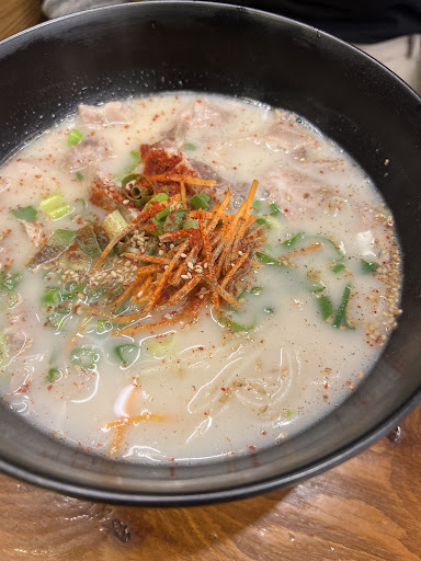 Ordered the meat noodles, decent serving of meat. The soup is not the rich type. The kimchi was pretty spicy. Also ordered the large portion of dumplings. They were cute, bite-sized dumplings but there were over 20 of it.