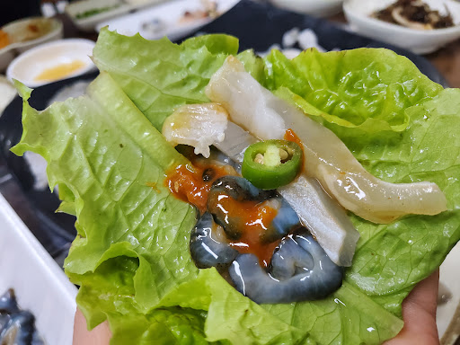 Read more이 곳 표선에서 꽤 유명한 표선수산마트. 저녁 7시반쯤 도착했고 바로앞에 주차를 편히 했다. 사람이 많아서 줄을 서고 대기하는 사람들이 안밖으로 많았지만 대부분이 포장손님이다. 왜냐면 여기 상차림값이 인당 4000원이라 비싼편이다. 우린 넷이 16000원을 지불해야했다. 그러니 입구에서 줄서서 원하는 해산물이나 회를 주문해서 주문표를 가지고 안에 들어가서 1층 카운터에서 포장손님은 계산 후 숙소로 가져가고, 먹고 갈거면 2층에 올라가면 그쪽으로 가져다 준다. 우리는 먹고싶은거 다 먹어보자고 해삼, 멍게, 산낙지,뿔소라와 도다리를 주문하니 수족관에서 바로 도다리를 잡아와서 작은거 두마리를 올리니 1.4키로가 저울에 잡혔다. 키로에 34000원이니 금액은 그닥 안비쌌다. 대부분은 그날그날 시가가 적혀있었고 총99000원이었고 2층에서 상차림비와 술, 매운탕은 지리(15000원)로 주문을 했다. 2층꺼는 따로 2층에서 계산한다. 주문한 것들이 차례대로 나왔는데 생각보다 양이 많았다. 일하시는 아주머니가 이것도 여기꺼냐고? 갖다주시며 놀래셨다.ㅋㅋ많긴 많았다. 못먹을 것 같은 양을 놀랍게도 다 먹은 우리는 마지막 매운탕이 나와서 맛있게 먹고 있는데 일행중 한 명이 숟가락을 뜨는순간ᆢ헉ㅡㅡㅡ 커다란 투명비닐이 나왔다. 그것도 숟가락 세 배의 크기만한ᆢ 넷이 동시에 얼음이 되어서ᆢ 직원을 부르고ᆢ다시 사장님을 불렀다. 다행히 여사장님이 정중히 고개숙여 사과를 하셨고 지리값은 안받기로 하셨다. 우리 일행중 암투병하는 친구가 있는데ᆢ 하필 그 친구한테 나온것이다. 에궁ᆢ 좋은것만 먹어도 아쉬울판에ㅠ 비닐 끓인 국을 먹었다 생각하니ᆢ헉ㅡㅡ했다. 그래도 사장님의 응대가 나쁘지않았기 때문에 기분좋게 잊기로 왜냐면 그전까지는 진짜 맛있게 잘 먹었기때문이다. 처음에 서비스안주로 나오는 새우, 오징어데침, 멍게중에 오징어데침을 더 주실수있냐 했더니 안된다고 했다(각3개씩나옴) 그럼 상차림비를 왜 받는거지? 했는데 비닐이 나오고 그걸 서비로 한 번 더 갖다 주셨다. 남은 술이 있기때문에 안주가 필요했기때문이다. 리필코너에는 톳무침과 무생채, 콩나물무침이 있고 상추는 없고 따로 부탁을 드려야 갖다주신다. 아무튼ᆢ배터지게 먹고 좋게 마무리하고 나왔다....