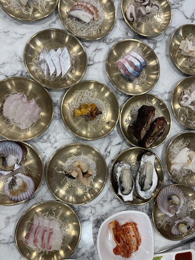 해산물 해산물은 대부분 익힌 것. 굴, 오징어류, 조개류 전부 갈치 고등어회가 과메기로 느낄 정도로 뻣뻣하고 육즙이 없음. 왜 김을 줬는지 이해가 갈 정도. 미역국 그냥 맛이 없음. 미역따로 물따로.
