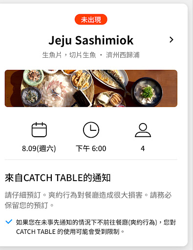 而且 我早在一個星期前已經預約好 但因天氣關係 想改早時間 catchtable指示是說要我先取消本來的預約 再重新預約一個新時間 結果成功預約新時間後 餐廳說我預約的時間點不夠昨天預約的韓國客人早 所以不給我們位置