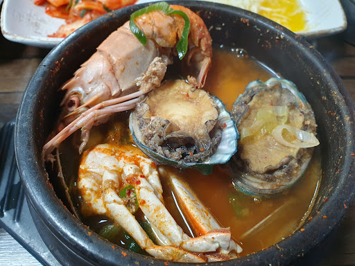 Every table seems to order the abalone rice in stone pot. There is a small margarine pot on the table for you to add to the rice. You don't need much - just run through the side of the pot and watch the margarine slide below and sizzle within. Approximately half a teaspoon- and if you like adjust accordingly but do not add more in the beginning. Do not stir the rice immediately. Allow a few minutes for the margarine to sizzle, crisp up the rice at the bottom and separate the rice bits from the stone pot. Amount of abalone is generous in this pot. Very tender. We also ordered the seafood hotpot. Also very generous with the amount of seafood within. (see pics) Banchan side dishes are delicious with good variety. Parking is easy - large space available in front of...