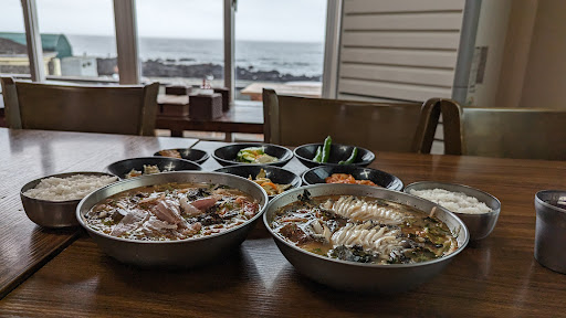 This place serves excellent Mulhoe (raw fish soup) the sliced abalone sashimi was very fresh. The dish features a unique sweet and sour chilled broth with crunchy raw abalone, noodles and lots of greens. Though recommended by the staff, the other seasonal raw fish soup we had was less enjoyable due to the hard and stiff texture of fish bones. Overall both were refreshing dishes to have with copious amounts of fresh seafood. I'd say this dish is quite unique and enjoyable, definitely a must try when in Jeju. Parking can be difficult as there's only 4 lots in front of the store, there's also a parking area further down...