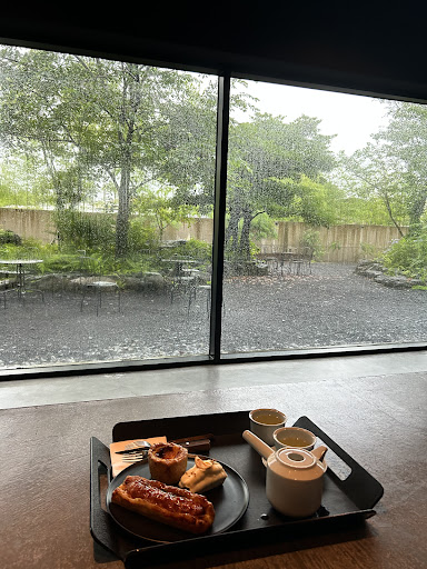 There are fresh bakeries laid out in classy glass boxes when you enter. Pick what you like and pass it to the counter when ordering your coffee before finding a seat in the cavernous interior seating area or a spot in the interior garden.