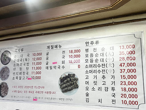 순대국 8000원 순대국(특)9000원