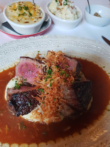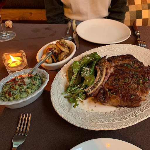 Read more우리나라에서 스테이크 3대 장인이라 불리는 정성구 셰프가 오너로 있는 스테이크 전문점이다. 가게 분위기는 전형적인 스테이크 집의 분위기가 흐른다. 식전 빵으로 나온 바게트 빵과 라구 소스는 정말 맛있다 내가 특히 라구 소스를 좋아해서 그런지는 몰라도 빵도 적당히 바삭하고 그거에 라구 소스를 올려 먹으니 이것만 먹어도 되겠다 싶더라 수프도 맛은 좋았으나 가격이 좀 센 편 메인으로 나온 뼈 등심 스테이크는 겉에 크리스피 함과 안에 촉촉함이 역시 스테이크 장인이라 불리는 사람이 요리하였구나 싶을 정도로 맛있게 먹었다 겉에를 칼로 긁으면 튀김에서 나오는 그런 크리스피 한 소리가 나고 등심이기에 지방이 꽤 붙어있는데 고기의 퍽퍽함을 확 잡아줘서 끝까지 느끼하지 않게 먹을 수 있었다 스테이크를 주문하면 3가지 사이드 디시를 고를 수 있는데 구운 버섯, 크림 스피니치, 맥 앤 치즈 이렇게 시켰다 크림 스피니치를 빼고는 매우 맛있게 먹었다 시금치 같은 경우는 내가 생각한 것보다 간이 약하여 스테이크랑 곁들여 먹어도 크게 와닿지 않았다 파스타는 딱새우 로제 파스타로 주문하였고 딱새우는 처음 먹어봤는데 새우 자체도 식감도 좋고 양도 많이 들어있다 하지만 파스타는 그냥 어디서든 맛볼 수 있는 맛이었다 후식으로 나온 티는 한 입 먹고 말았다 물론 티 종류가 9가지 정도 되었는데 티를 좋아하지 않는 나로서는 먹자마자 무슨 맛인지 이해가 안...
