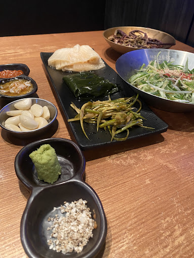 ✔ 기본 상차림도 완벽! 백김치, 미나리간장무침, 파무침까지 나오고, 쌈채소는 요청하면 따로 가져다주셔요. 소금, 와사비, 새우마늘장, 쌈장까지 소스도 다양해서, 어떤 조합으로 먹어도 꿀맛!