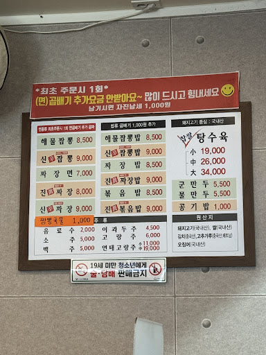 예전에 여기 다녀 왔었고 맛 은 있었으나 짜장면엔 돼지고기가 한점도 없고 해물 짬뽕은 홍합만 잔뜩 있고 왕새우 다랑 1개 있어 실망 스럽다고 했었다.그래서 별3개 주었다.몇일 전 해물짬뽕을 먹었는데 다른 해물과 오징어가 들어 있어 깜짝 놀랐다.쩌음 이었다.그래서 오늘은 짜징면 곱배기를 금방 먹었다.거진 다 먹었는데 돼지고기가 여러점 있어 맛있게 먹었다.돼지고기도 처음 먹었다.정말 즐거웠다. 내 리뷰를 보고 개선 한건지 아닌지는 모르지만 지난 번 보다 좋아 졌으니 별 4개.계속 관심을 가지고 이용 하겠고 1회성이 아니라 계속 유지 된다면 나중에 별 5개로 상향 하겠다.항상...