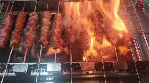 The meat is cooked over a hot bed of coals on skewers which rotate back and forth to cook the meat evenly without you having to do it constantly. Then when the meat is cooked and you can put them on the metal rack above the fire to keep them warm.