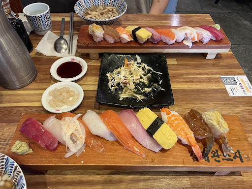 특히 인기가 많은 오마카세 메뉴는 11피스로 구성되어 있으며 연어 뱃살, 광어, 성게알, 장어, 문어, 전복, 참다랑어 등 신선한 재료가 풍성하게 들어가 있습니다.