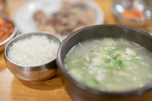 The broth is clear and flavorful, packed with generous portions of tender beef tendon and cartilage. The side dishes, including kimchi and pickled garlic, complement the soup perfectly.