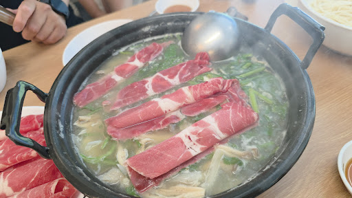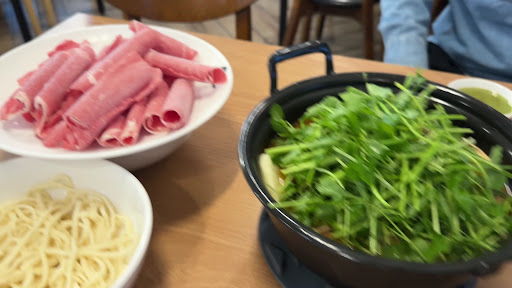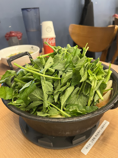 주문하고 조금 기다리니 푸짐한 채소와 고기, 그리고 향긋한 미나리가 한가득 담겨나왔어요. 국물은 자극적이지 않고 맑고 시원한 맛이라 아이들도 부담 없이 잘 먹었고, 미나리 향이 은은하게 배어 있어서 먹는 내내 개운하더라고요. 고기도 얇게 썰려 나와서 샤브샤브용으로 딱이었어요.