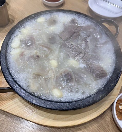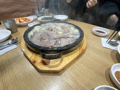 This is the best bone broth soup place I had in Korea. While the place looks very old, it's extremely clean. We ordered the platter (모듬수육) which comes with both beef and knee cartilage. While I had knee cartilage before, this was exceptional. The size and the quality. It comes with some cabbage and fresh kimchi. Cartilage, cabbage and kimchi together makes it work. The dish is served in sizzling stone plate, with loads of garlic. If you're in the Seoul Forest park area is this a must visit. Place is pretty small so don't go with...
