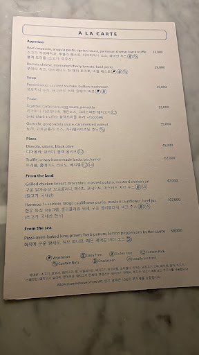 A wonderful high end experience, great service, good quality food, and authentic Italian cuisine. I have very strict dietary restrictions and was able to find gluten free and keto/paleo style options here! This has been difficult to find in Seoul, but the team were extremely accommodating of my needs and offered alternative options with pleasure. It is indicative of high level service when a restaurant can premeditate your needs and make your dining experience feel special with simple gestures like bringing GF bread and small dessert offering (blueberries instead of pastry) to the table without having to request it. I had a green garden salad (very fresh with quality olive oil) and chicken diavolo with roasted vegetables. My husband had the lasagne, which he said was amazing. Menu was extensive in general with pasta & pizza options (even some pasta is available gluten free!) plus selection of classic protein mains. The space itself is beautiful with high ceilings, large and airy floor plan, and pretty ambient lighting. We arrived early and were seated at a private booth. Overall very happy So good we will be back again...