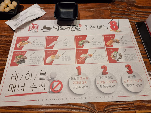 Read more자주 애용하는 곳, 일반적으로 호불호가 적은 메뉴들로 주로 새우, 연어, 롤 등이 메인이며 인기가 좋았다. 함께 곁들여진 소스 등과 조화가 좋았고 새우,참치 등 타다끼도 있어 향도 마을 업 시켜주는 메뉴들, 다만, 바쁜 시간대 또는 한가한 타임에 간혹 다양한 메뉴제공이 안되거나 주문해서 먹을 수있는 메뉴가 있어 회전스시만의 속도전에 간혹 브레이크가 걸릴수있어 여유갖기! 위생에 조금 더 신경써주면 더 만족스러울거같다 손님들도 스스로 개인 위생 규칙 지켜야겠지만, 간혹 레일 근처에서 먹으며 말하는 무념무상 손님들로 입맛이 떨어진다. ...