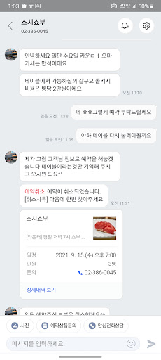 '오마카세 테이블' 메뉴는 2층의 오마카세가 아니고, 애초에 예약개념이 없는 듯 합니다. 이 초밥집은 1층 스시집과 2층 오마카세 바로 나눠져있는데, 간단히 말해 1층은 판초밥집, 2층은 오마카세집입니다. 1층 홀 손님은 예약과 상관 없이 계속 받으시는 것 같습니다. 스크린샷 내용은 예약한 오마카세 예약이 다 찼다며 원하지 않던 1층 판초밥집을 같은 오마카세인냥 안내하고, 예약 시간에 자리도 마련되지 않아 항의한 내용입니다.