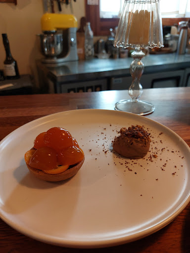 디저트는 카운터에서 주문하는 방식이 아니라, 착석하면 주문을 받으러 오세요. 다만 포장주문은 카운터 주문입니다. 이 때문에 저희가 기다리는 동안 뒤에 온 포장 손님이 마지막 1개의 푸아그라 시부스트를 가져가셔서 너무나 아쉬웠습니다... 그리고 파티시에 한 분이 혼자 운영하시다 보니 포장하고 주문 받으시는 데 시간이 많이 걸립니다. 일손이 더 필요해 보였어요. ♤ 웰컴 디저트 화이트 와인 및 자스민차가 들어간 가나슈 위에 딸기 튈을 올린 입가심용 디저트입니다. 가볍고 달콤한 화이트 초콜릿이라고 생각하시면 될 것 같아요.