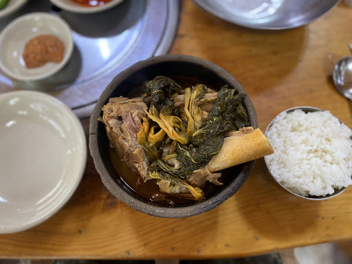 뼈해장국은 곧바로 나왔고 뚝배기에 정강이뼈 하나와 등뼈 두 개가 들어있어 빈틈이 안 보였다. 위엔 우거지가 듬뿍 얹혀있었는데 추가는 따로 안돼 아쉬운 부분이다.